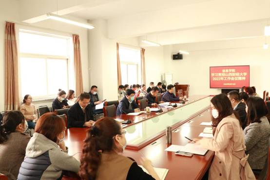 学院党委书记周红斌向全体教职工传达了2022年学校工作会议精神,全文学习了党委书记丁耀武题为《实事求是 真抓实干 奋力谱写财大高质量发展新篇章》的讲话和党委副书记、校长田祥宇题为《勇于开拓 狠抓落实 全力开启学校创新发展新格局》的工作报告,以及对学校2022年工作“围绕一条主线、一个根本、三个立足、七个基点”的“1137”布局和谋划推进30项重大工作的安排部署做了全面解读,对学校在党建引领、深化改革、学科建设、人才培养、科学研究、对外交流等方面的工作要点做了具体解析。